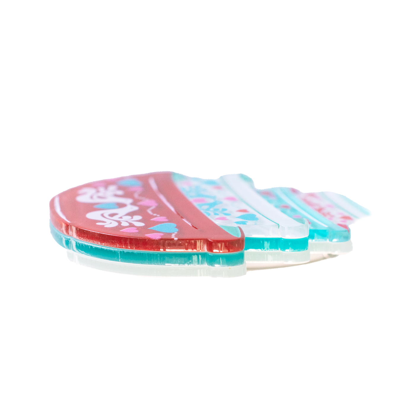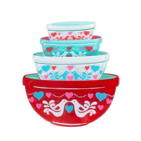 Add a touch of vintage charm to your outfit with Lipstick & Chrome's Lovebirds' Nesting Bowls Brooch! Made of high-quality acrylic, this quirky and sparkly brooch features a pair of lovebirds on a stack of Pyrex dishes. Lightweight and comfortable to wear, it's the perfect gift for bird lovers, Pyrex collectors, and vintage enthusiasts.