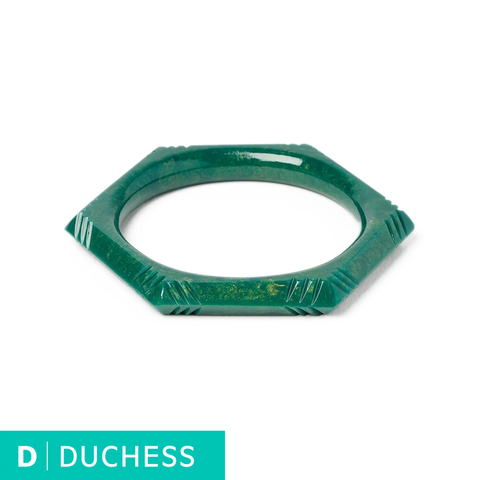 Slim in size but big on style, the Narrow Jadeite Bangle is a must-have for vintage-inspired stacks. The hexagonal shape and green resin with a golden sheen give it a bold yet classic feel.