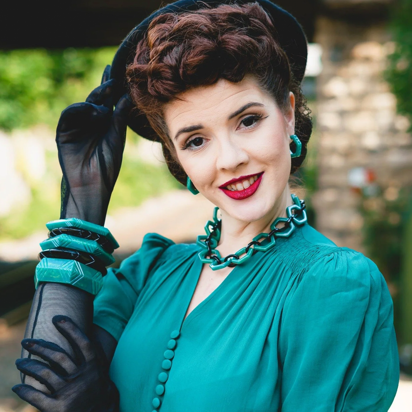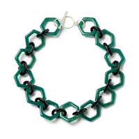 Make a statement with the Jadeite Necklace. The carved hexagonal shapes in bold green resin feature a soft golden shimmer, creating a striking 1930s-inspired piece to wear alone or layered.