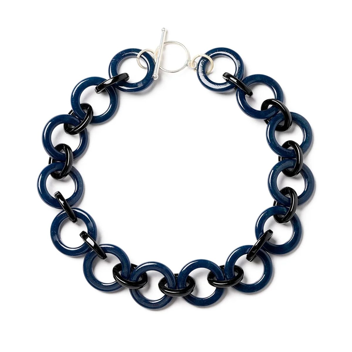 Simple, striking and full of vintage glamour, the Nocturne Necklace is made up of carved dark navy resin links with a subtle golden shimmer, alternating with jet black links. The round shapes and silver-tone hardware nod to 1930s jewelry design.