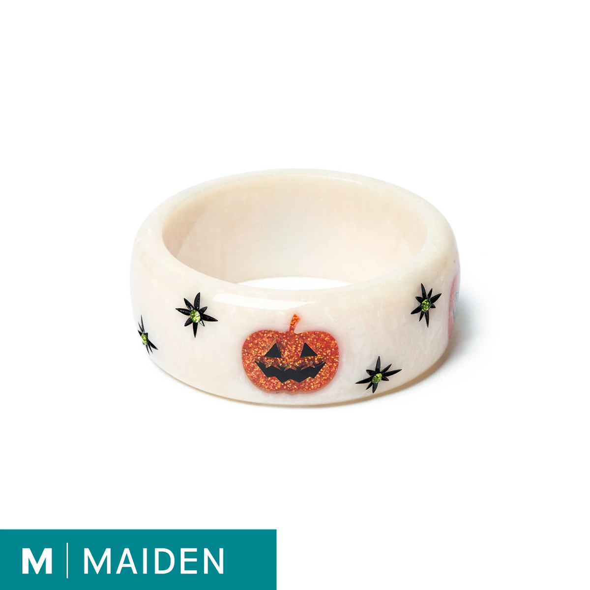Bold and bright, the Wide Gourdgeous Bangle is the star of any spooky stack. Shiny white resin is inlaid with pumpkin details and studded with gems, giving all the glow of a jack-o-lantern without the carving mess.